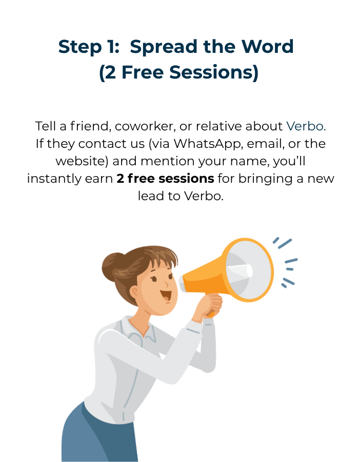 Our Referral Program rewards you with up to 8 free sessions every time you refer a friend who connects, tries, and joins Verbo.